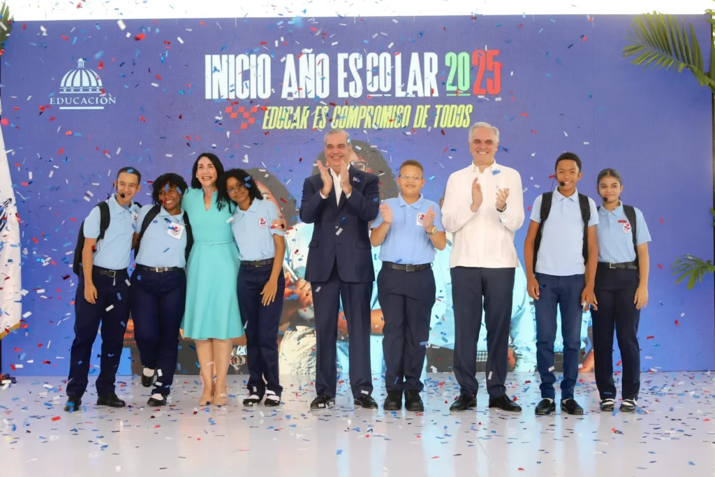 Santo Domingo.- El presidente Luis Abinader y el ministro de Educación, Luis Miguel De Camps, dieron inicio al año escolar 2025-2026, en la recién inaugurada Escuela Casandra Damirón en Santo Domingo Este, con la participación de más de 2 millones 62 mil estudiantes en todo el país. El acto se realizó bajo el lema «Educar es compromiso de todos» y contó con la presencia de la primera dama, Raquel Arbaje, autoridades educativas y miembros del gobierno.