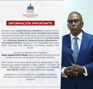 SANTO DOMINGO: Se informa a la ciudadanía que, a partir del lunes 2 de febrero, todas las comunicaciones dirigidas al Plan Social y a los Comedores Económicos, incluyendo las solicitudes de almuerzos, raciones crudas, enseres y demás requerimientos, serán recibidas en la sede central de la Dirección General de Asistencia Social y Alimentación Comunitaria (DASAC), ubicada en la Av. España #2, Villa Duarte, Santo Domingo Este, República Dominicana (Antiguo Plan Social).