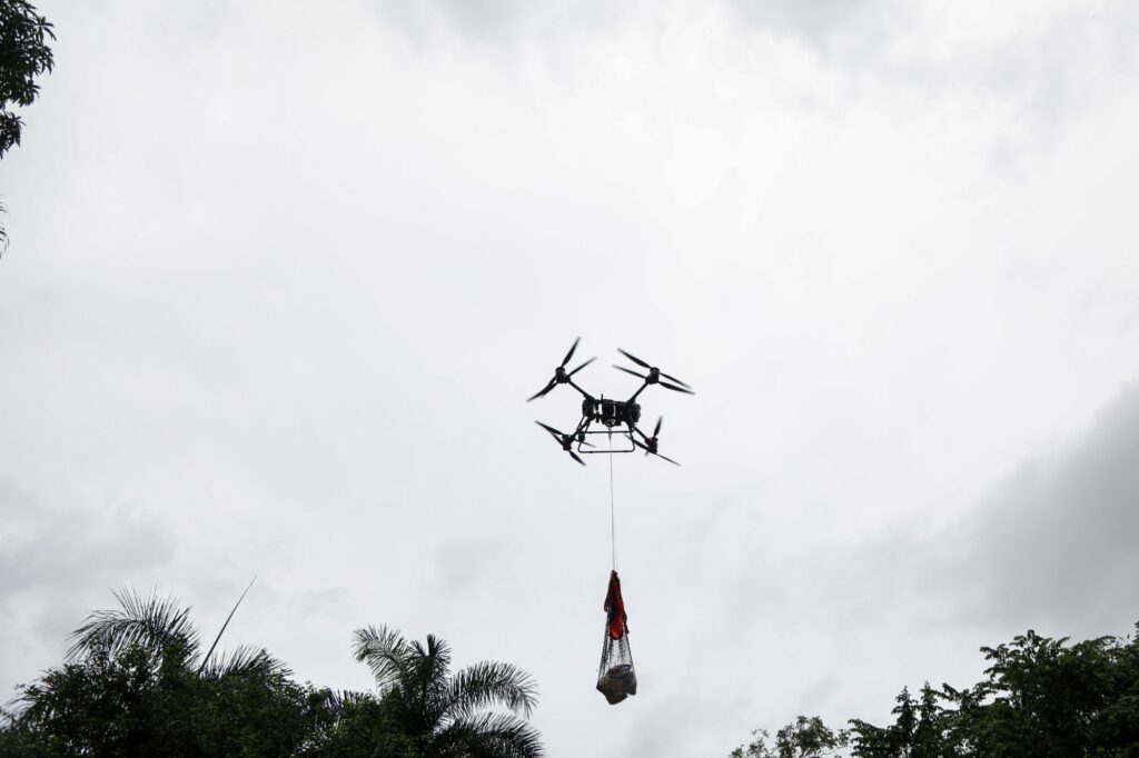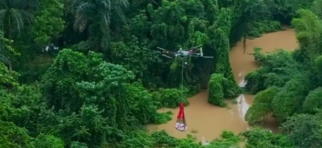 Santo Domingo, 26 de octubre de 2025. – El Sistema Nacional de Atención a Emergencias y Seguridad 911, en coordinación con la Dirección de Asistencia Social y Alimentación Comunitaria (DASAC), realizó la entrega de kits raciones crudas en el municipio Santo Domingo Norte mediante el uso de drones de carga, como parte de las acciones de apoyo a las comunidades impactadas por las lluvias del fenómeno atmosférico Melissa.