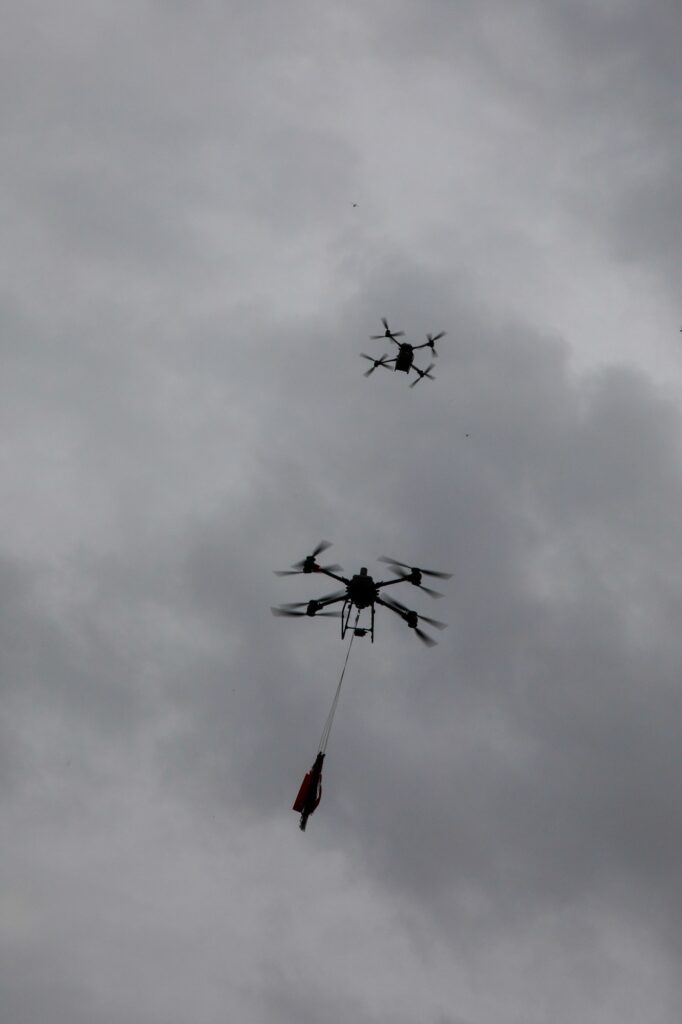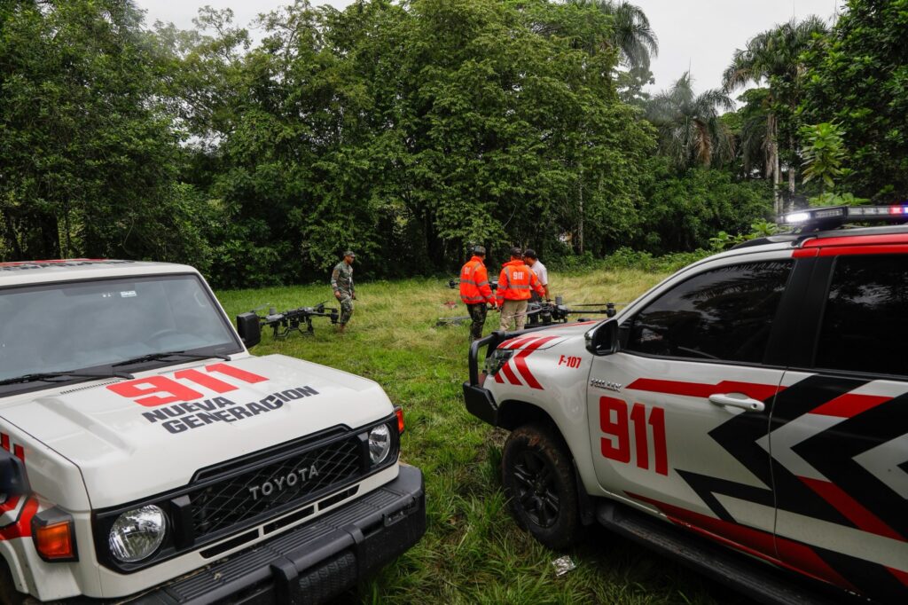 Los drones del 911, operados por personal especializado, realizaron el traslado aéreo de los alimentos, permitiendo que las raciones llegaran de manera rápida y segura pese a las condiciones adversas del tiempo.