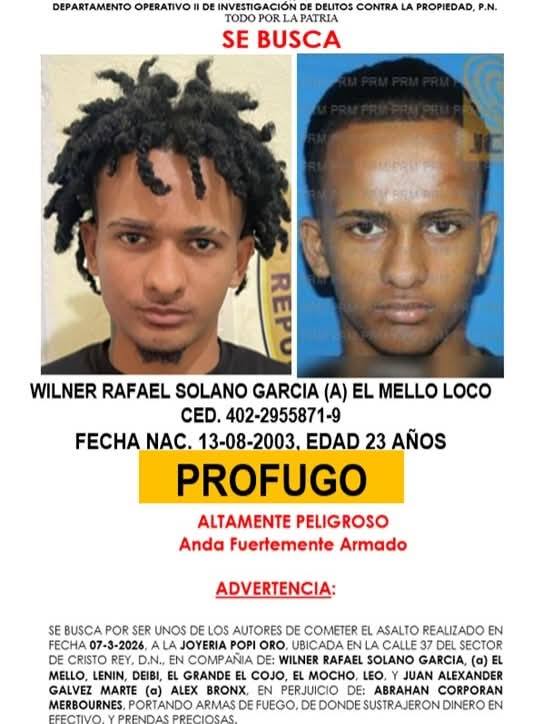 Santo Domingo. — La Policía Nacional informó que activó la búsqueda y localización de varios prófugos vinculados al asalto a mano armada contra la joyería Popi Oro, ocurrido el pasado 7 de marzo en el sector Cristo Rey, en el Distrito Nacional.