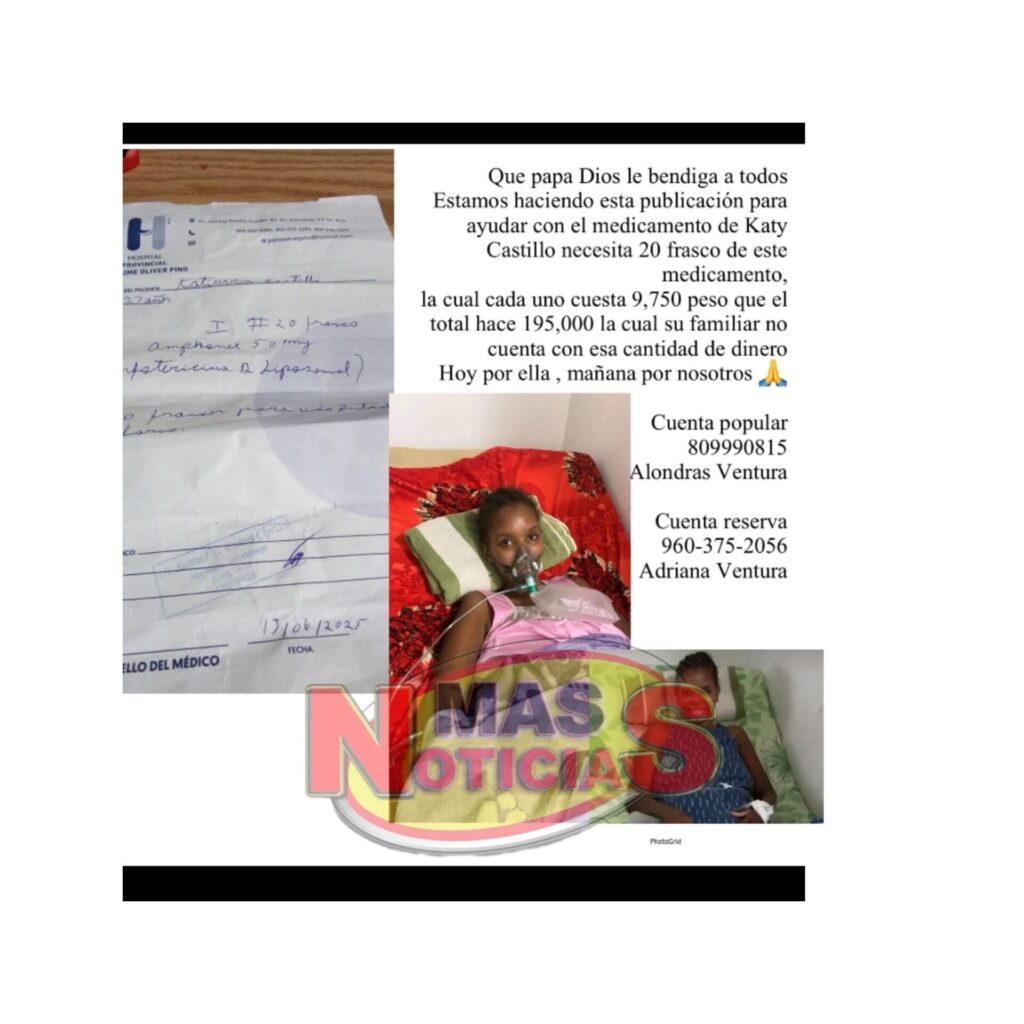 Katy, quien se encuentra en estado delicado de salud y actualmente está ingresada recibiendo oxígeno, requiere 20 frascos del medicamento Amphotericin B liposomal, cuyo precio unitario es de 9,750 pesos, sumando un total de 195,000 pesos dominicanos, monto con el que su familia no cuenta.