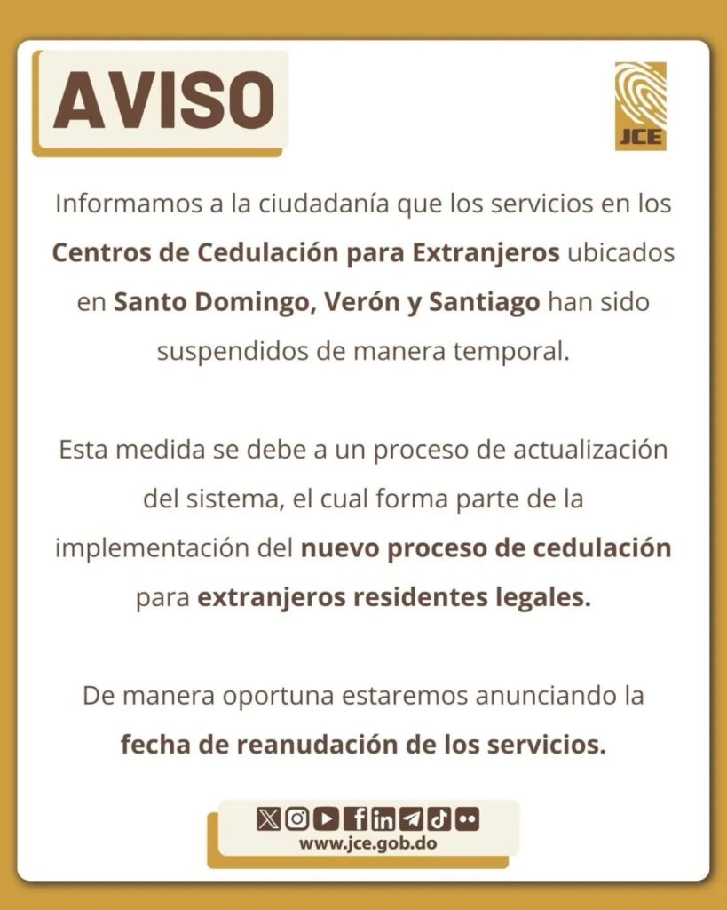 Informamos que de manera temporal, han sido suspendidos los servicios en los Centros de Cedulación para Extranjeros en Santo Domingo, Verón y Santiago.