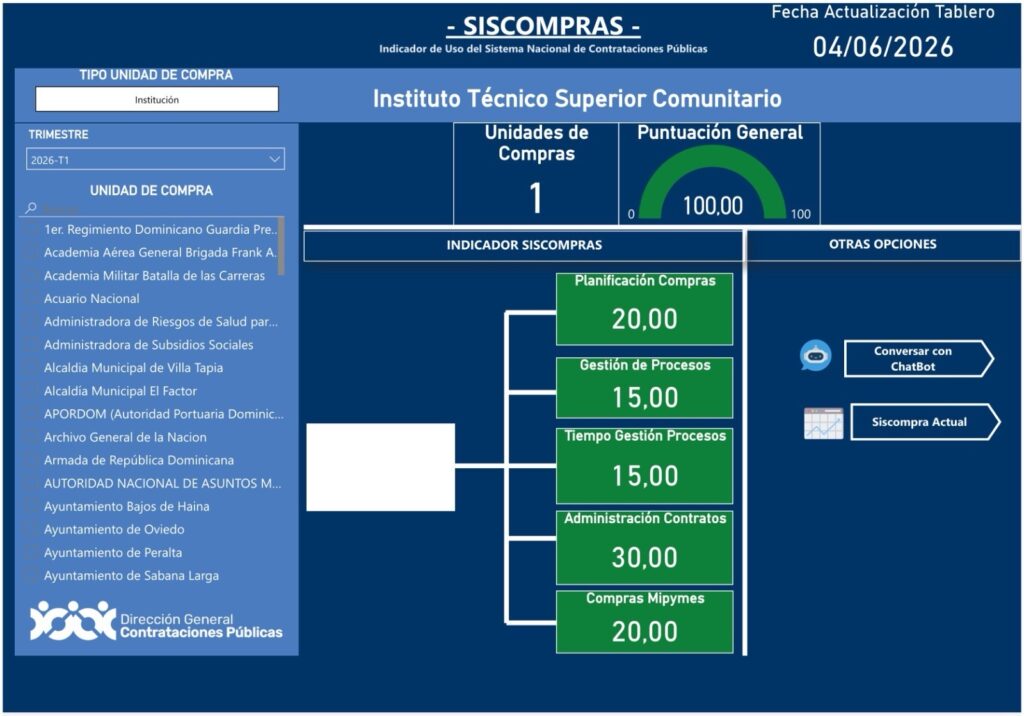 San Luis, Santo Domingo Este. – El Instituto Técnico Superior Comunitario (ITSC) alcanzó la máxima puntuación, (100 de 100) en el Sistema de Monitoreo de Compras Públicas (SISCOMPRAS), correspondiente al primer trimestre de 2026, consolidándose entre las instituciones con mayor nivel de cumplimiento en la gestión de compras del Estado dominicano.