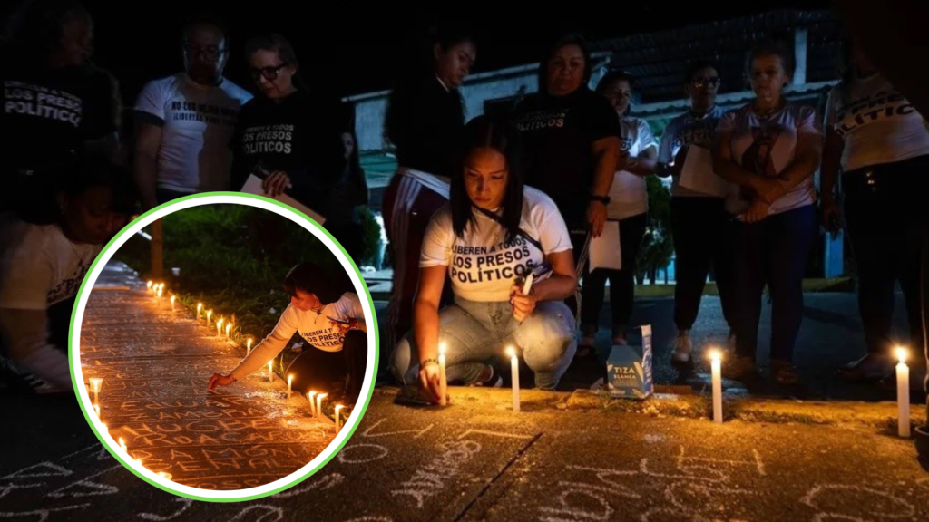 Los familiares encendieron velas y escribieron en el suelo los nombres de los presos políticos en esta noche de vigilia y oración por sus seres queridos.